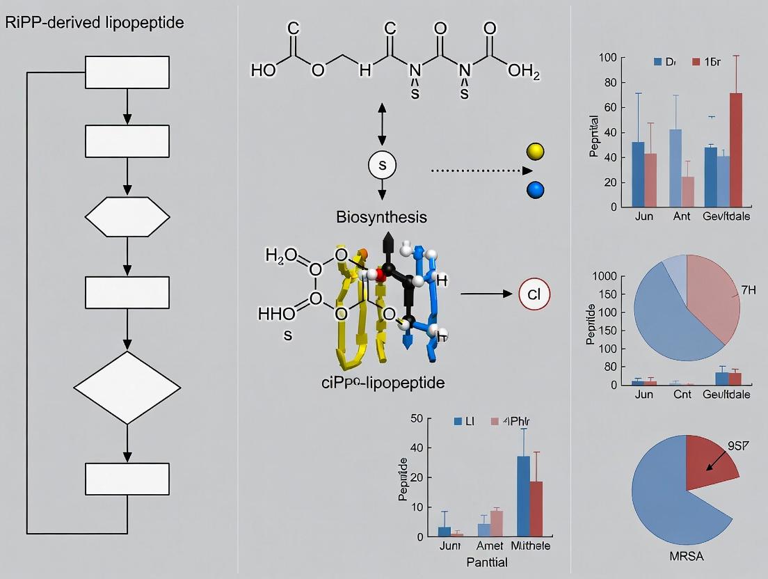 This comprehensive review explores the emerging potential of RiPP-derived lipopeptides as a promising new class of antimicrobial agents against Methicillin-Resistant Staphylococcus aureus (MRSA). It covers the foundational science of ribosomal synthesized and post-translationally modified peptides (RiPPs) and their structural lipopeptide derivatives. The article details innovative methodologies for RiPP discovery, bioengineering, and activity enhancement, while addressing key challenges in stability, toxicity, and production. It critically evaluates the comparative efficacy of leading RiPP-derived candidates against conventional and last-resort antibiotics. Aimed at researchers and drug development professionals, this analysis synthesizes the current state of the field and outlines a clear pathway from natural product discovery to clinical translation, emphasizing the urgency of developing novel agents against multidrug-resistant pathogens.