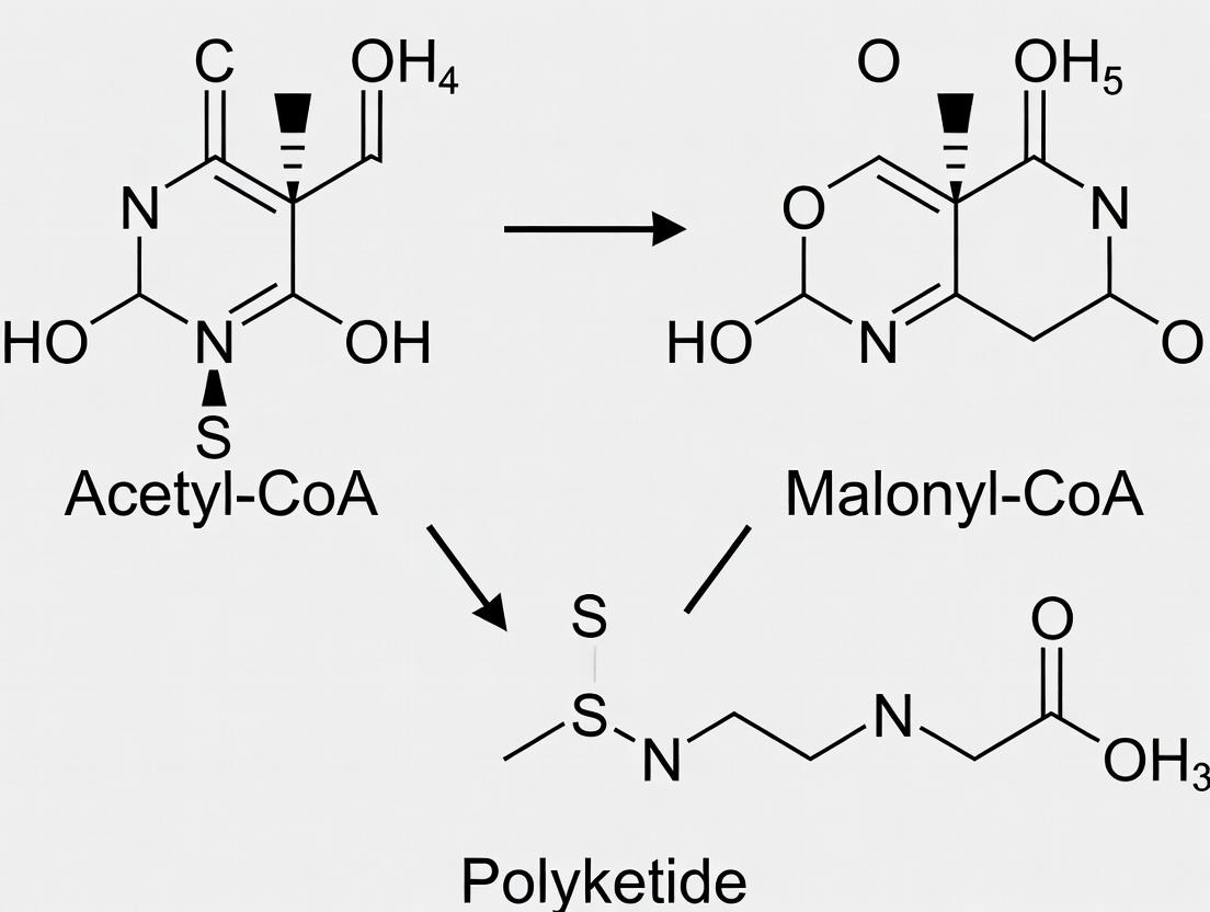 The biosynthesis of all polyketides initiates from the central metabolites acetyl-CoA and malonyl-CoA. Malonyl-CoA is derived from the carboxylation of acetyl-CoA by acetyl-CoA carboxylase (ACC). Polyketide synthases (PKSs) then catalyze sequential Claisen condensation reactions, extending the growing polyketide chain with malonyl-CoA-derived units. The programming of the PKS—determining the number of extensions, the degree of β-keto reduction, and subsequent cyclizations—dictates the final chemical structure and, consequently, the bioactivity.