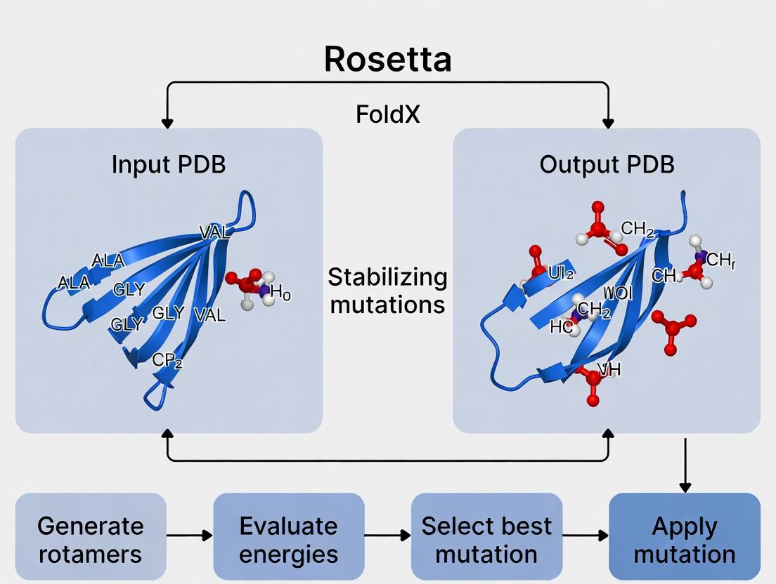 Protein stability, defined as the thermodynamic propensity of a protein to maintain its native, functional fold, is a fundamental biophysical property with profound implications across molecular biology and biotechnology. Accurately predicting stabilizing mutations is critical for enhancing protein function, understanding disease mechanisms, and developing robust biologics. Within our broader thesis research, we employ computational tools like Rosetta and FoldX to predict mutations that increase protein stability (ΔΔG < 0). This document provides detailed application notes and protocols for this workflow.